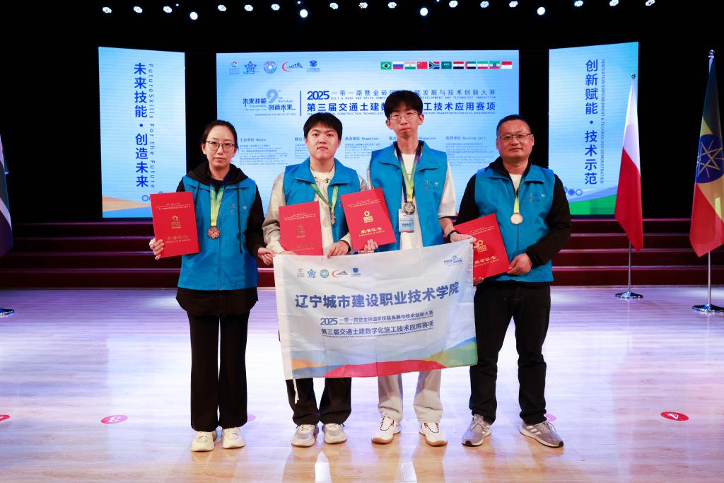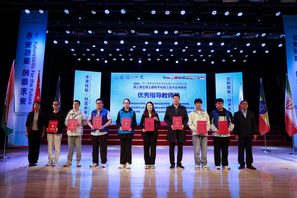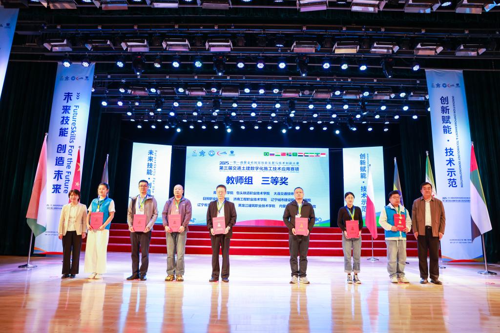9月25日至27日,2025一带一路暨金砖国家技能发展与技术创新大赛第三届交通土建数字化施工技术应用赛项全国总决赛在黑龙江省哈尔滨市隆重举行。经过激烈角逐,我校市政工程学院道路与桥梁工程技术专业叶欣翰和徐景彬两名同学获得国赛学生组二等奖,市政工程学院黄健、宁波两位教师获得国赛教师组三等奖,学校获“最佳组织奖”,黄健和宁波两名指导教师获“优秀指导教师”。