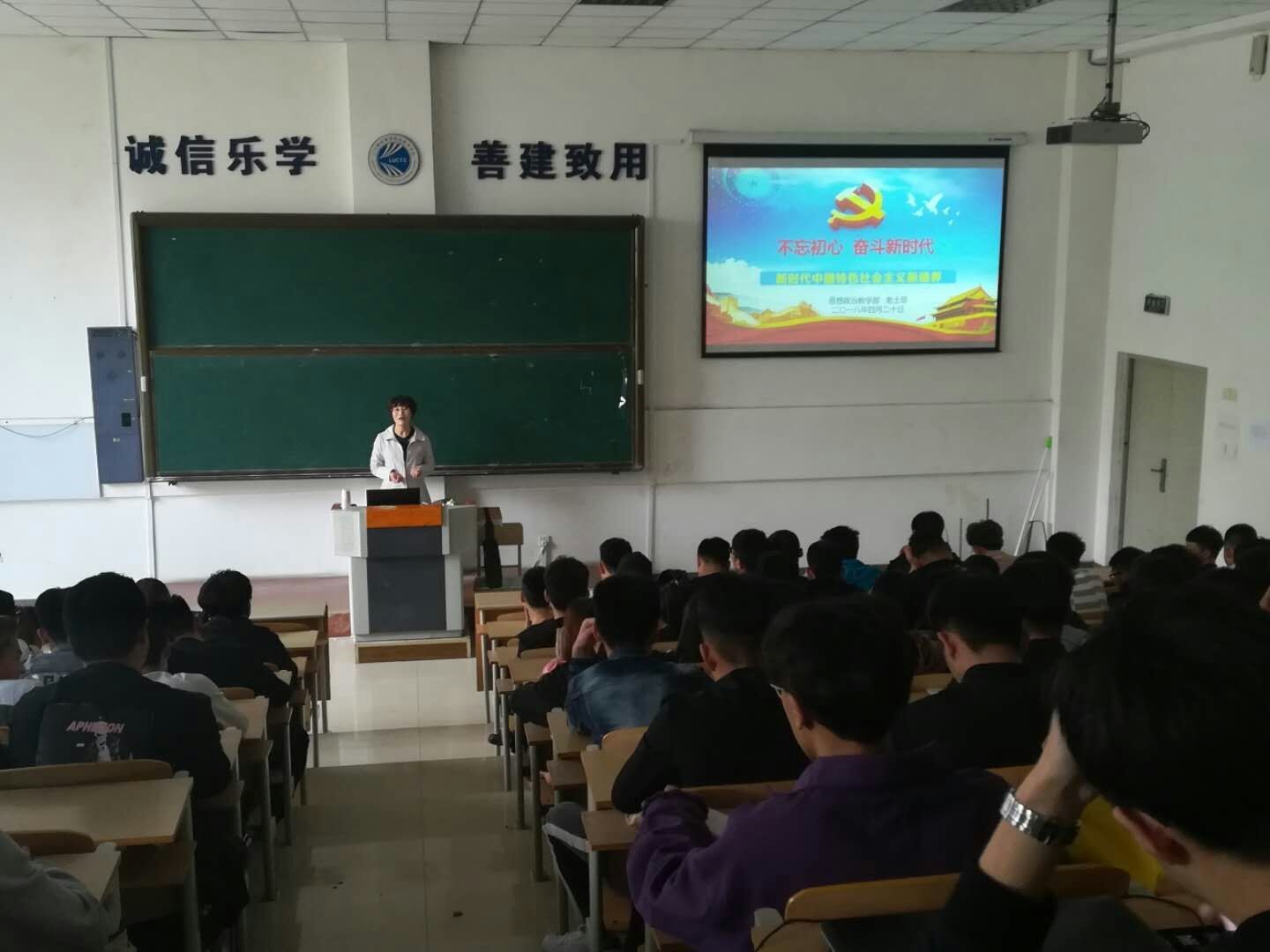 2018年是持续深入学习贯彻十九大精神之年。为使大学生深刻领悟新时代的科学内涵,不忘初心,牢记使命,坚定“四个自信”,牢固树立“四个意识”, 2018年4月20日,思想政治教学部教研室主任老士翠在阶梯教室作了题为《不忘初心