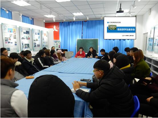 2016年12月8日下午,思政部在思想政治教育综合实践室B324召开了思想政治理论课学生代表座谈会。座谈会由思想政治教研室主任老士翠主持,王英华老师负责记录,学生代表40余人参加了座谈会。
