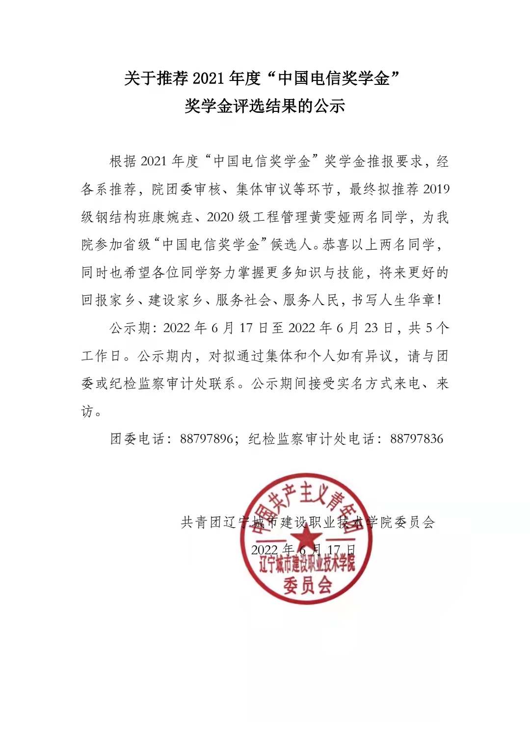 关于推荐2021年度“中国电信奖学金” 奖学金评选结果的公示