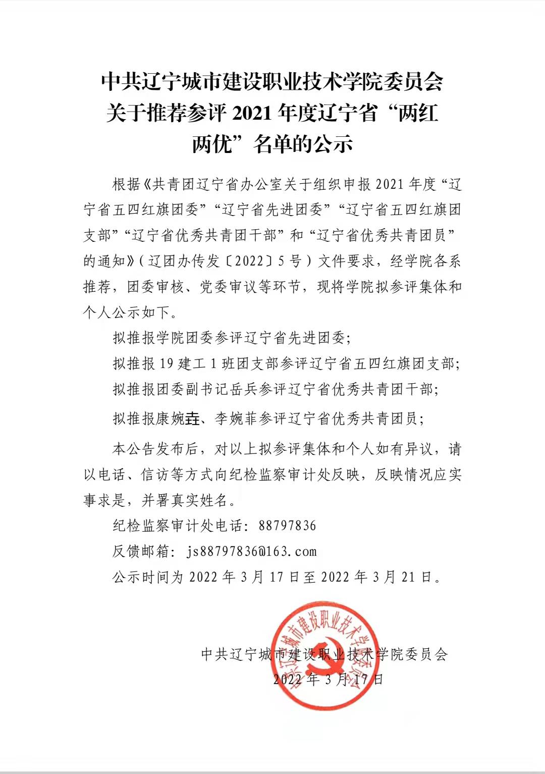 中共辽宁城市建设职业技术学院委员会 关于推荐参评 2021 年度辽宁省“两红 两优”名单的公示