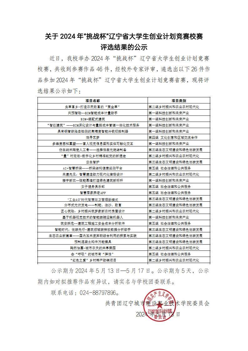 关于 2024 年“挑战杯”辽宁省大学生创业计划竞赛校赛 评选结果的公示