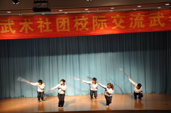 本场武术社团专场晚会由气势磅礴的花式双截棍开场,我院12级新生带来的表演《单刀会》、传统拳《壮志凌云》、《搏武花棍》以虎虎生风的拳劲,舍我其谁的气势,将中国功夫展现的淋漓尽致。沈阳航空航天大学北方科技学院带来的双截棍《飞火流星》让人眼花缭乱,惊险处令在场观众连连惊呼。辽宁金融职业学院表演的《兵器串烧》将双截棍、双刀、九节鞭完美连贯的展现,气势恢宏,惊心动魄。辽宁交通高等专科学校带来的《双扇、流星锤》表演似搏似舞,连绵宛转。各路高手的高超武术水平令观众们赞叹不已,全场掌声不断,演出获得了圆满成功。