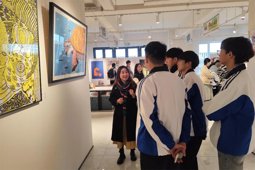 本次艺术展是由沈北新区团委主办,展出了30位青年艺术家和沈阳师范大学美术学院学生的优秀作品。学生们在艺术展馆工作人员的详细讲解下,了解了艺术展的筹备背景和艺术创意的产生方法,深刻体会了创作者们通过绘画、书法、摄影等多种艺术形式表达出的对生活、情感和社会的思考与感悟。参观过程中学生们积极互动、深入交流、场面热烈。