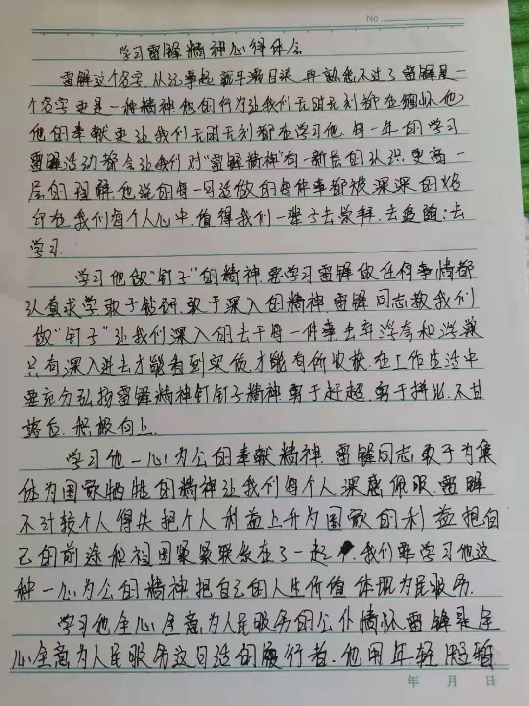 通过对雷锋精神的学习,让我感受到了自己做的还远远不够,可以说他就是我的榜样,在时时刻刻的提醒我,要不怕苦、不怕累,工作中要认认真真做事,全心全意为人民服务,紧跟党的步伐,生活中,要严格要求自己,始终保持着先进带头作用,不断刻苦学习,求真务实。
