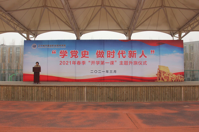 党委书记高玉英发表讲话。她指出,2021年是中国共产党成立一百周年和国家“十四五”规划开局之年,学院全体师生要深入学习贯彻习近平总书记在党史学习教育动员大会上发表的重要讲话精神,做到学党史、悟思想、办实事、开新局,通过同升一面旗、共唱一首歌,激发历史责任感、使命感和爱党爱国情怀,以昂扬姿态奋力开启2021年春季学期新征程。